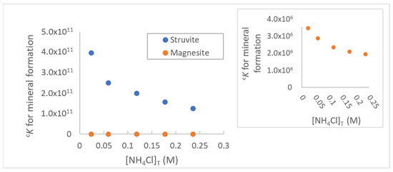 where K is the equilibrium constant at infinite dilution (i.e., zero ionic strength), and γ values are activity coefficients that depend on ion charge and size. Since activity coefficients for charged species are always less than one, the cK values shown above are always less than the corresponding K values, meaning that the driving force for mineral formation decreases as the ionic strength increases. The effect of ionic strength on cK values, calculated by MINEQL+, for the formation of struvite and magnesite as a function of [NH4Cl]T for Mg char at pH 8, is illustrated in Figure 4. (cK values for bobierrite showed a similar trend, but were much larger (ranging from 1021.7 to 1020.8 for the lowest and highest concentrations of [NH4Cl]T, respectively) and were omitted from Figure 4 to better illustrate the other data.)