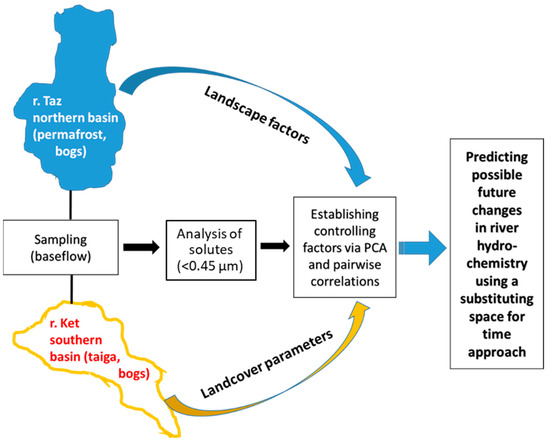 In the present study, we used a coupled hydrochemical/landscape (land cover) approach that allows revealing the main environmental factors controlling the hydrochemical composition of the river water. Up to now, such an approach has been efficiently used only for single-point sampling of small rivers [13,14,15,16,17,18,19] and one large Siberian River [20] but has not been implemented at the scale of the whole watershed of medium-size rivers. Toward better understanding of land cover control on riverine C, nutrient and metal transport, we chose two medium size rivers of western Siberia, Taz (Swatershed = 150,000 km²) and Ket (Swatershed = 95,000 km²) located within permafrost-bearing forest-tundra/tundra and permafrost-free taiga biomes, respectively. Both rivers drain through similar sedimentary deposits overlayed by peatland and forest/tundra; they are virtually pristine (population density < 1 people km−2) and have no industrial or agricultural activity on their watershed. Within the on-going drastic climate change in Siberia, the southern river (Ket) can be considered as an extreme scenario of long-term transformation of the northern River (Taz) in case of complete disappearance of discontinuous permafrost and northward migration of the taiga forest. Therefore, our primary objective in this work was to test the impact of climate and land cover parameters (permafrost, vegetation, water coverage, soil organic carbon, and lithology), on carbon, major and trace element concentration in the main stem and tributaries of each river separately and when considering them together, across contrasting climate/permafrost zones. A flowchart of methodology and approach used in the present study is illustrated in Figure 1. We anticipate that, via employing similar approach for two sufficiently contrasting and yet representative river basin of the WSL, we can provide essential information for coupled land—River C, nutrient and metal fluxes for climate modeling of the region and to foresee future, long-term changes in much large territory of strongly understudied permafrost-affected Eurasian lowlands, which includes North Siberia, Anabar, Kolyma and Yana-Indigirka lowlands, with an overall territory more than 2 million km².