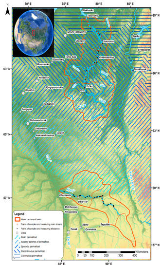Climate change, which is mostly pronounced in high latitudes, strongly impacts the chemistry of rivers and streams and can bring yet unknown consequences on carbon, nutrient, and metal export from land to ocean thus enhancing the retroactive link to climate change drivers [1,2,3,4]. There are numerous case studies of climate change impact on surface and groundwater sustainability and hydrochemistry, such as those performed in temperate/subtropical regions [5,6]. However, huge northern unpopulated territories of the world remain poorly covered by a coupled hydrochemical/hydrological approach. This is especially true for pristine permafrost-bearing regions located at high latitudes and containing sizable amount of carbon in the form of peat, organic litter, and vegetation. An example is Western Siberian Lowland (WSL), located in the gradient of climate and permafrost zones within essentially the same lithological background, minimal variations in river runoff and relief and moderate to negligible anthropogenic activity. The interest of the WSL is that it contains huge peat resources and presents rather shallow, essentially discontinuous to sporadic/isolated permafrost, highly vulnerable to thawing [7,8,9,10]. For this relatively large territory (2 million km²), extensive studies of small [11,12,13,14,15,16,17,18,19] and large [20] river dissolved, colloidal and particulate load, chemical composition of soil ice and suprapermafrost waters [21,22,23,24], and gaseous regime of rivers and lakes [25,26,27] have been performed. However, the majority of these studies except that of the Ob River [20] dealt with single site sampling of a given river, without addressing the spatial variability of riverine solutes within a watershed. This is a clear shortcomings of current state of knowledge of western Siberian rivers, because without sufficient spatial coverage, one cannot test the impact of various landscape factors on water hydrochemistry within the same river basin.