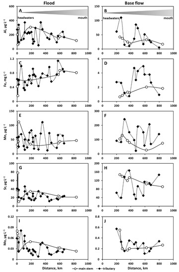 Al (A,B), Fe (C,D), Mn (E,F), Sr (G,H) and Mo (I,G) concentration in the Ket River main stem (open circles) and tributaries (solid diamonds) during spring flood (A,C,E,G,I) and summer baseflow (B,D,F,H,J).