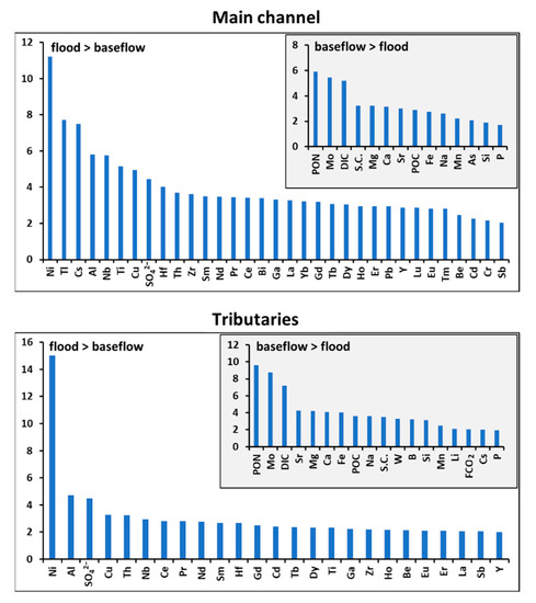 Mean ratio of element concentrations between spring flood period and summer baseflow in the Ket River main stem and tributaries.