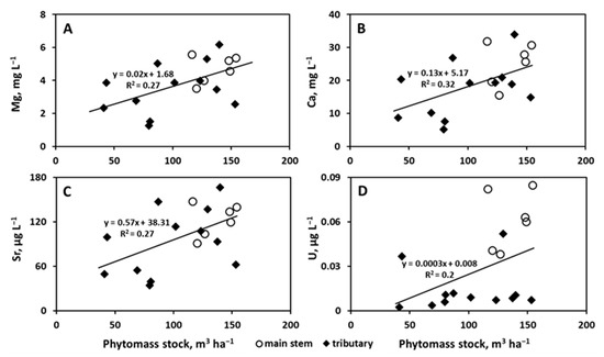 A pairwise (Pearson) correlation of major and trace element concentration in the main stem and tributaries of the Ket River with main land cover parameters of the watershed was tested for both seasons, but notable correlations were observed only for the summer baseflow (Table S3). These correlations were detected only for alkaline-earth elements (Mg, Ca, Sr) and U, whose concentrations positively correlated (RPearson ≥ 0.5; p < 0.05) with phytomass stock on the watersheds (Figure 5). However, the observed correlations do not necessarily indicate a direct control but may be the consequence of the fact that carbonate-bearing loesses are most favorable substrates for productive forests compared to clay, sand and peat –rich soils [20]. The carbonate minerals of these substrates are known to act as sizable sources of alkaline-earth metals and uranium [the latter is carried in the form of highly labile uranyl-carbonate complexes] in shallow subsurface and groundwater feeding the river during summer baseflow [16,17]. Other elements did not demonstrate any sizable correlations to the landscape factors. The most likely reason for paucity of such a control is highly homogeneous coverage of the river basins by forest, bogs, and riparian zones with essentially the same climate, runoff, vegetation, soil, and total phytomass stock, represented by similar tree species of the boreal taiga of permafrost-free zone of the WSL.