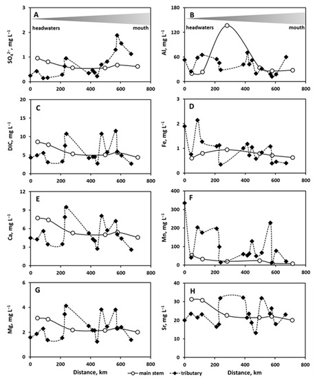 SO42− (A), Al (B), DIC (C), Fe (D), Ca (E) Mn (F), Mg (G), and Sr (H) concentration in the Taz River main stem and tributaries during summer baseflow.