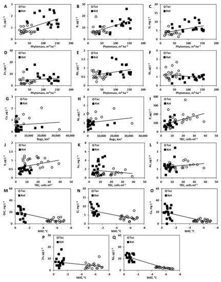 Pairwise correlations of several major and trace elements with two most pronounced landscape parameters—Phytomass stock at the watershed and bog coverage, total bacterial count (TBC) and mean air temperature, for both Taz and Ket river main stem and tributaries.