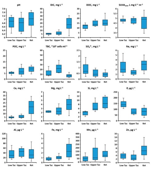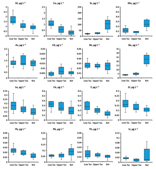 Elements concentration in Upper Taz (0–400 km from the mouth, northern part), Low Taz (400–800 km from the mouth, southern part), and Ket River (main stem and tributaries). Box represents median, whiskers correspond to lower and upper quartile.