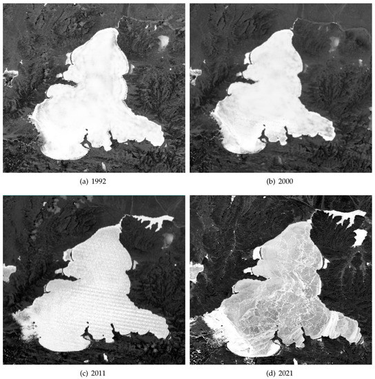 Ngoring Lake is an oligotrophic plateau lake with a clear water body [43], which satisfies the Class I water quality standard of “Surface Water Environmental Quality Standard” [39]. NDWI can achieve a better effect of water boundary extraction. Based on the preprocessed remote sensing images, the BandMath of the ENVI+IDL program is used to input the NDWI calculation formula, and the water body information is highlighted through the band ratio relation, as shown in Figure 5. The raster vector transformation of the segmented object is carried out using the Rastertopolygon tool in the Arcmap software to obtain the information of the berthing boundary of Ngoring Lake. Combined with manual visual interpretation, the final surface area of the lake is calculated.
