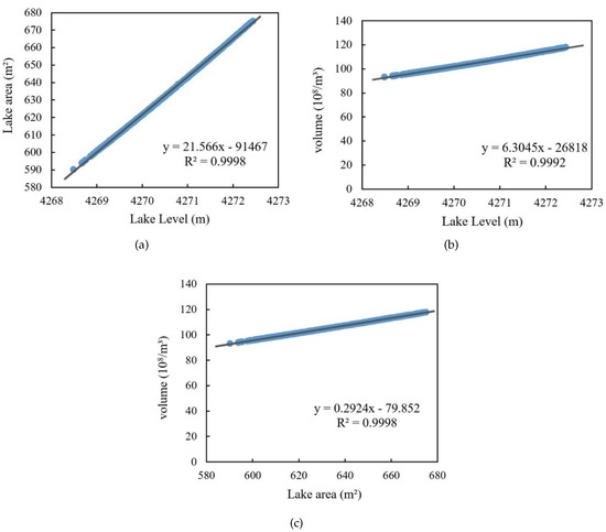 Figure 11a–c shows that the water level, the lake surface area, and the water storage capacity have a statistically significant correlation, respectively. Among them, the correlation R2 among the water level value and lake surface area, lake surface area, and water storage capacity is as high as 0.9998, and the correlation R2 between water level value and lake water storage capacity is as high as 0.9992. Therefore, reconstructing the water level value or surface area is highly accurate at the corresponding time based on the water level value or lake surface area to estimate the lake water storage change information.