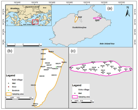 (a); Location map of Osakishimojima Island in the Seto Inland Sea showing the sampling points in (b); Kubi village and (c); Ocho village.