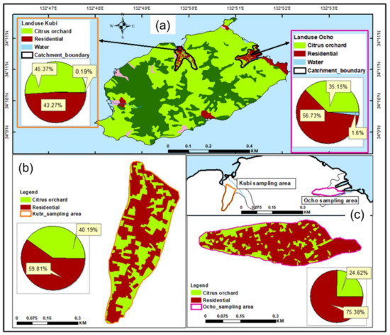 Land use of Osakishimojima, showing proportions of citrus orchards and residential areas in (a); Kubi and Ocho lowland areas, (b); Kubi sampling area, and (c); Ocho sampling area.