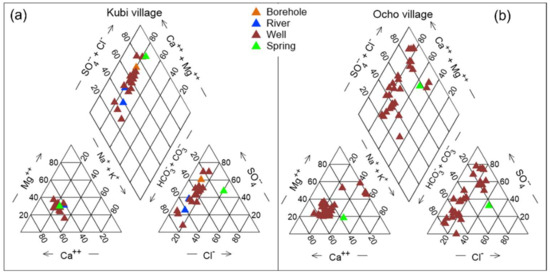 Calcium was the most dominant cation in both study areas and ranged from 7.8–38.1 mg/L in groundwater samples and from 9.8 mg/L−35.5 mg/L in surface water samples in Kubi while in the Ocho area, concentrations ranged from 0.5 mg/L–4.6 mg/L in surface water and from 8.8 mg/L−50.8 mg/L in groundwater samples. Magnesium concentrations ranged from 1.6 mg/L−15.3 mg/L in groundwater samples and 4.5–14.4 mg/L in surface water in Kubi whereas in Ocho village, these concentrations where much lower, varying from 4.9 mg/L–22.2 mg/L in groundwater samples (Table 2). Calcium and magnesium can contaminate groundwater through ion exchange when minerals dissolve in rocks or when fertilizers run off and leach into the groundwater. According to Earle [47], soils containing CaCO3 and CaSO4 have high levels of Ca2+ in the groundwater because of leaching, and Keesari et al. [48] suggested that agricultural runoff and sewage disposal may lead to high Mg2+ levels in the groundwater. The most abundant anion detected in the water samples from both villages was HCO3−. In the Kubi area, concentrations of HCO3− in the river samples ranged from 50.6–61.2 mg/L with a mean value of 55.9 mg/L, while HCO3− concentrations in wells ranged from 14.2–121.6 mg/L with a mean value of 45.3 mg/L (Table 1). Bicarbonate concentrations in Ocho ranged from 4.5 to 64.2 mg/L in the wells and from 4 to 9.25 mg/L in the spring samples. The dissolved species in the samples obtained from both villages (arranged in sequence from highest to lowest average concentrations) were Ca2+ > Na+ > Mg2+ > K+ cations and HCO3− > SO42− > NO3− > Cl− anions. The chemical compositions of the water samples from Kubi and Ocho villages were examined and classified using trilinear plots (Figure 3).