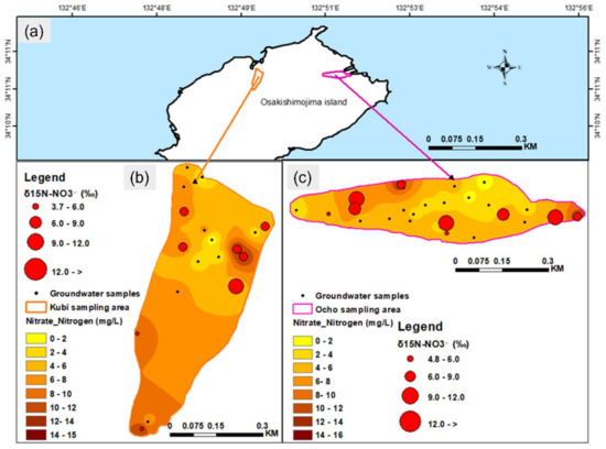 (a) Osakishimojima Island, Spatial variation of NO3−−N and δ15N-NO3− concentrations in groundwater of (b) Kubi and (c) Ocho villages.