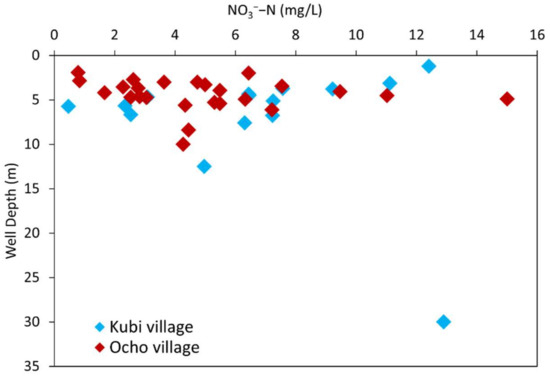 Leaching of chemical fertilizers into the groundwater, which are subsequently transported downstream, could be responsible for the elevated NO3−−N concentrations in Kubi. In contrast, Ocho village had lower NO3−−N concentrations, with some sampling points showing relatively high NO3−−N concentrations, including upstream, midstream, and downstream sampling points (Figure 4c). Groundwater contamination was likely caused by organic fertilizer inputs or leakages from the septic systems. The NO3−−N concentration was observed to be between 3 and 8 mg/L at well depth between 4 and 6 m (Figure 5).