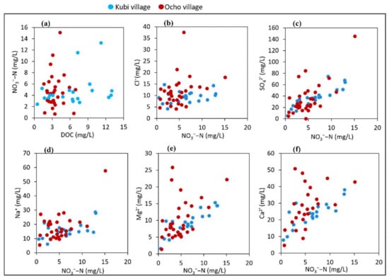 Relationship between NO3−−N and (a), DOC, (b), Cl−, (c), SO42−, (d), Na+, (e), Mg2+, and (f), Ca2+ in groundwater samples of Kubi and Ocho villages.