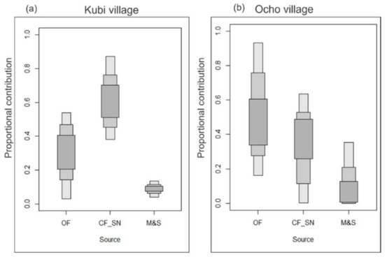 A Bayesian model was applied to determine the potential NO3− contribution from each of four sources for Kubi and Ocho villages: δ15N-NO3− in manure and sewage (M&S), chemical fertilizer (CF), and organic fertilizer (OF); and soil nitrogen (SN) × (k = 4). The end-member isotopic compositions for the three sources were used (j = 3) in the model setup. SN and M&S samples were not analyzed in the study area, so the SN values [25,33,34,35] were compared with the N present in the CF samples, and because similar values were obtained, they were considered as a single source (CF_SN) of N in this study area. The M&S values were obtained from the published literature and used in the model as an additional source. We considered M&S to be a suspension of water and solid waste from humans and animals transported by sewers and OF exclusively to be a mixture of chicken litter and sawdust. Although discrete samples of individual 15NNO3 sources in the study area were measured, the limited number obtained may induce a biased model outcome. Alternatively, the mean values of δ15N-NO3− isotopes (μjk) and associated SDs (ωjk) of different M&S were acquired by consulting previously published data [25,33,34,35], whereas CF and OF were obtained from the Kubi area.