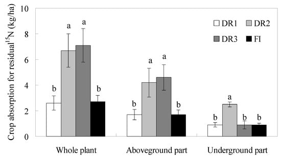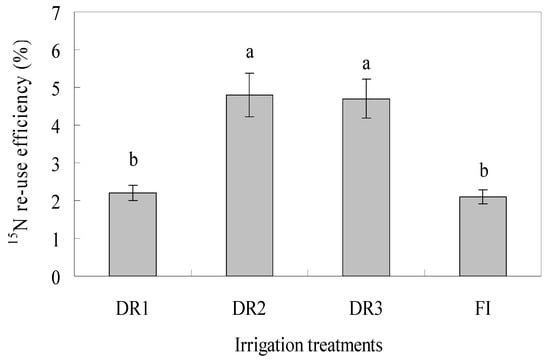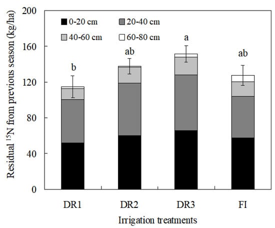 The amount of soil residual 15N from the previous season and its distribution in different soil layers (DR1, DR2, and DR3 mean the lower irrigation limits of 75%, 65%, and 55% accounting for the field capacity, separately. FI represents furrow irrigation treatment using the same irrigation regime as DR2. The data in the Figure are mean ± SD. The different letters (a, b) indicate significant differences at the level of 0.05 according to Duncan’s multiple range test).