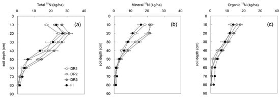 After the cultivation of succeeding lettuces, 15N was mainly residual in the soil layer of 10–50 cm, and the residual amount in the 20 cm layer was the highest (Figure 5a). DR3 was the highest in the soil total 15N amount for all layers from 10 to 50 cm, and the soil total 15N amount in 20 cm and 30 cm layers under DR3 reached 30.8 and 26.5 kg/ha respectively. The distribution of soil total 15N under DR2 and FI was similar. For DR1, the 15N in 10 cm soil layer was relatively low, but there was an increasing trend from the depth of 10 to 40 cm.