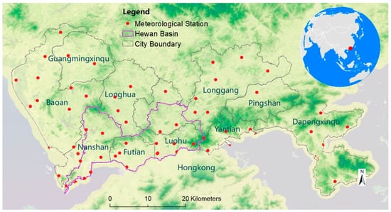 The rainfall scheme mainly included three forms: ① the actual short-duration heavy rainfall process in Shenzhen over 10 years, from 2008 to 2018; ② the designed rainfall process according to the temporal and spatial distribution characteristics of short-duration rainfall; and ③ the design rainfall process with the Chicago rainfall pattern. The study area and distribution of the automated weather stations are shown in Figure 1.