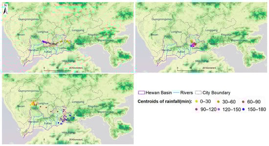 According to the different temporal and spatial distribution types of rainstorms, the short-duration heavy rainfall process in Shenzhen was divided into three categories. The trajectories of the centroids for the three types of rainfall events are shown in Figure 2, in which different colored points represent rainstorm centers in different periods [26]. In the first type, the rainstorm center moves rapidly from west to southeast within 180 min; in the second type, the rainstorm center moves rapidly from east to west within 180 min; and the third type of rainfall is concentrated, and there is no movement. These three types of characteristic rainfall processes express the temporal and spatial distribution characteristics of short-term heavy rainfall in Shenzhen, of which the first type of rainfall has the highest frequency in the flood season.