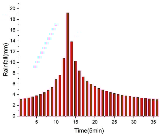 The rainfall process with the Chicago rainfall pattern with 3 h cumulative rainfall at each station from 30–500 mm with 2 mm steps, as shown in Figure 3, was designed for a total of 236 rainfall events.