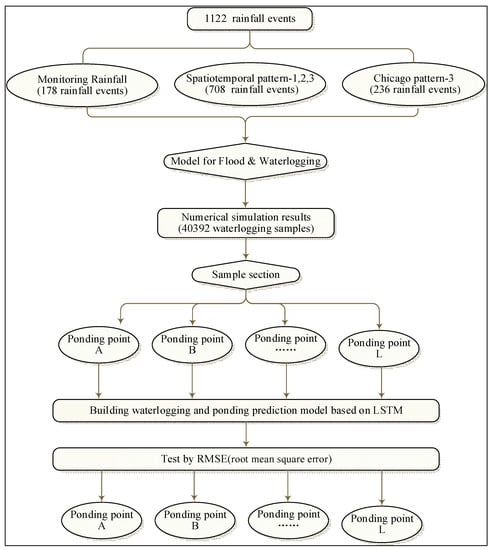 Through these three types of rainfall schemes, a numerical simulation model was used to simulate waterlogging and ponding, and 1122 rainfall events lasting 3 h were calculated. The number and type of samples satisfied the requirements of the neural network model for learning samples. This method is illustrated in Figure 4.