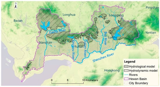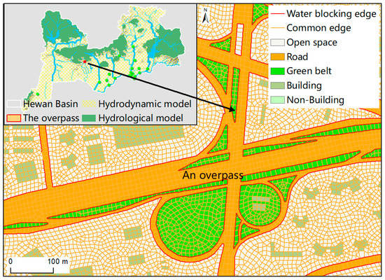 With recent advances in technology, the urban flood simulation method has evolved from a simple model to a complex model that combines hydrological and hydrodynamic models with underground pipe network models [27]. In this study, hydrological and hydrodynamic models were established in built-up areas, while only hydrological models were established in non-built-up areas. The coupled model, including the one-dimensional river model, two-dimensional surface model, and an underground pipe network, was established in key areas.