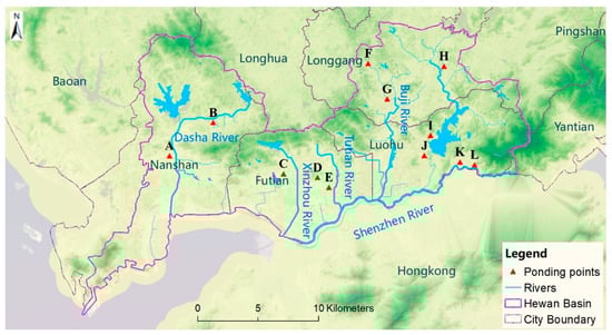 Intelligent and accurate neural network models require high-quality samples for training. Therefore, in this study, the actual rainfall process was used to check the numerical simulation model to obtain more accurate training samples. The results showed that the accuracy of the numerical model simulation results was high and could satisfy the requirements for the learning sample quality. This study utilized a rainstorm in Shenzhen on 29 August 2018 as an example. A total of 12 ponding points from west to east in the Shenzhen River and Bay Basin were selected to compare the maximum ponding depths of these points between the measured values and model simulation data. The distribution of the ponding points is shown in Figure 8, and the comparison results are presented in Table 1.