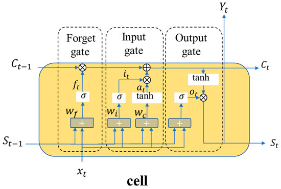 A long short-term memory (LSTM) neural network model is an improved version of the recurrent neural network (RNN) model, which was proposed by Hochreiter and Schmidhuber [29]. Compared with the RNN model, a hidden state Ct and three gates, the forget, input, and output gates, were added to the LSTM model to solve the problem of gradient disappearance or gradient explosion in the RNN model [30]. The structure of the model is shown in Figure 9.