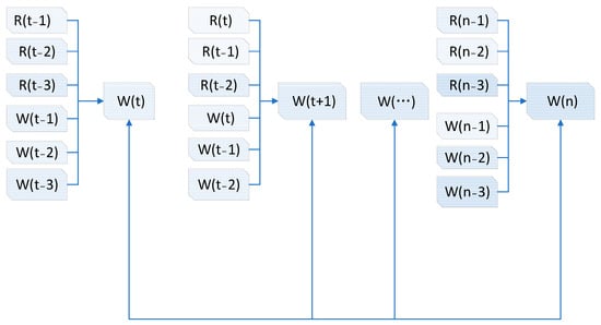 where the output of the forget gate is determined by the sample of this time series and the outputs of the previous time’s hidden layer , where is the activation and sigmoid functions. The output of the forget gate represents the probability of forgetting the hidden-cell state of the previous layer. The output of the input gate is shown in Equations (9) and (10), where the activation function in Equation (9) is a sigmoid function, and the activation function in Equation (10) is the tanh function.