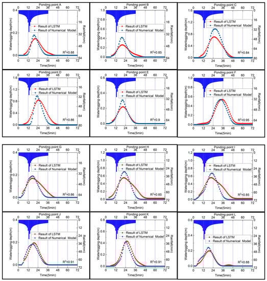 As shown in Figure 11 and Figure 12, the numerical and LSTM models could simulate and predict the ponding process of each ponding point under different rainfall conditions. Moreover, the fitting error of the simulation results of the two models was very small, and the determination coefficient, R2, was greater than 0.85.