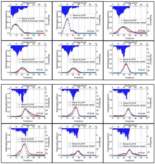 Using 12 points (points A–L) from west to east in the Shenzhen River and Bay Basin (Figure 8) as the analysis object, the rainfall process without training was input into the numerical simulation model and the trained LSTM neural network to predict the ponding depth. The input rainfall was 6 h at 5 min intervals. The first 3 h was the design rainfall process with the Chicago and characteristic rain types, and there was no rainfall in the last 3 h to completely simulate the rain–waterlogging–recession process. To compare the calculation results of the two models more intuitively, process lines of the prediction results of the numerical and neural network models were constructed. The similarity between the two curves was determined by the determination coefficient R2. The closer the determination coefficient R2 is to 1, the higher the fitting degree of the two curves.