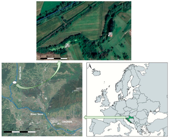 This study was conducted in NW Croatia (about 30 km from Zagreb) in the littoral zone of the Sutla River backwater. The Sutla backwater is a natural water body connected to the Sutla River and divided into two barely connected basins: (a) the upper basin (S1) covered by submerged macrophytes dominated by Ceratophyllum demersum, and (b) the lower basin (S2) without macrophyte stands (Figure 1). These basins differed in their morphometry, water transparency, and macrophyte cover. The study area has been described in detail in previous studies [2,7].