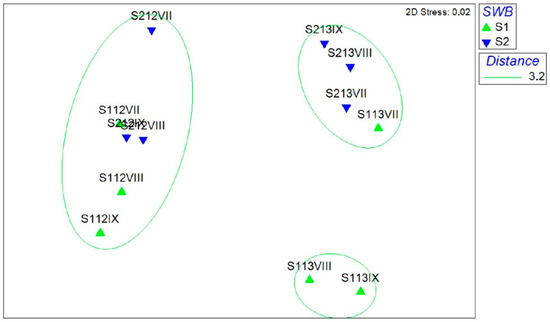 Non-metric multidimensional scaling (NMDS) ordination based on differences in summer environmental conditions in 2012 (LWL) and in 2013 (HWL). Explanation of symbol codes plotted in the diagram: e.g., S112IX refers to S1—shallow water body, 12—year 2012, roman numerals indicate the months.