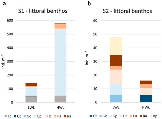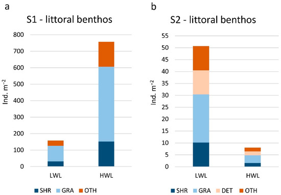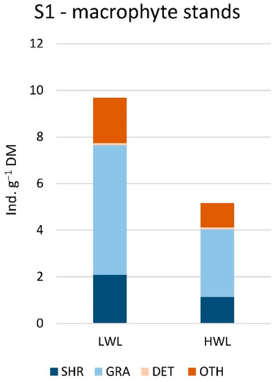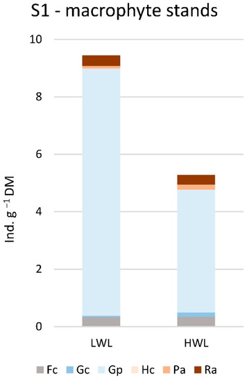 In the littoral benthal area of S1 (Figure 6a) grazers also dominated in both periods, but in contrast to the macrophyte stands, the number of all groups was significantly higher in the HWL season, and there were no detritivores.