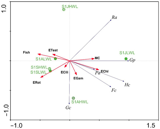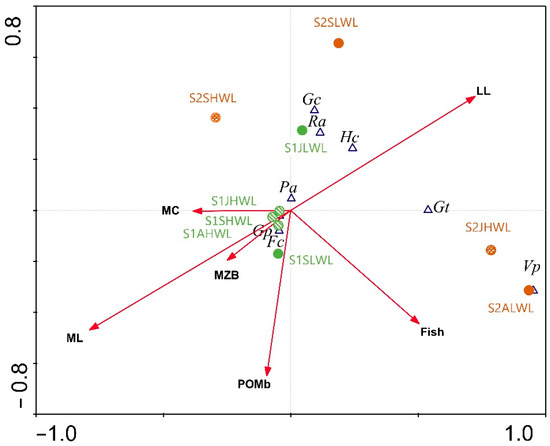Multivariate similarity analysis (ANOSIM) was used to identify differences or similarities in water depth and other environmental variables between the two years studied, while SIMPER analysis was used to calculate the contribution of each gastropod species (%) to dissimilarity between LWL (2012) and HWL (2013) years [7]. Interactions between selected environmental parameters and food resources LL—leaf litter; ML—macrophyte litter; macrophyte coverage—MC; fish length—Fish; particulate organic matter in benthos—POMb; macrozoobenthos excluding gastropods—MZB; chlorophyll a concentration in epiphyton—Echl; epiphyton abundance of Gymnamoeba—EGam, Testacea—ETest, Ciliophora—ECili, Rotifera—ERot; abundances of the gastropod species (Fc—Ferrissia californica; Hc—Hippeutis complanatus; Gc—Gyraulus crista; Gp—Gyraulus parvus; Gt—Galba truncatula; Pa—Physella acuta; Ra—Radix auricularia; Vp—Valvata piscinalis) and gastropod functional feeding groups (FFG) at each study site (S1 and S2) were analyzed by canonical correspondence analysis (CCA) or redundancy analysis (RDA) using the Canoco 4.5 program [51]. The statistical significance of the analyzed correlations was tested using the Monte Carlo permutation test (499 permutations). For all statistical tests, a p-value of 0.05 was used as an indicator of statistical significance.
