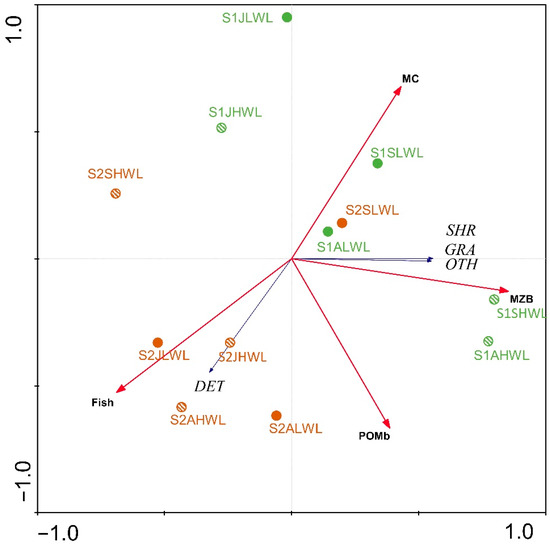 The analyses of environmental parameters for both years 2012 and 2013 have already been described in detail in previous studies [2,7]. During the summer period in each year, environmental data did not indicate a significant difference between two SWB, S1 and S2 (Mann-Whitney, p > 0.05), thus we indicated those values as average for both SWB during the summer season at LWL and HWL, respectively. Physicochemical water parameters [water temperature (Temp), dissolved oxygen concentration (DO) and pH] were measured with a portable pH and dissolved oxygen meter (Hach HQ30d, Loveland, CO, USA); electrical conductivity (EC) with a portable conductivity meter (Hach sensION 5, Loveland, CO, USA); pelagic water transparency (Trans) with a Secchi disc (zSD) to determine the environmental characteristics of the SWB. Macrophyte cover was expressed as a percentage (MC, %). An additional 1-litre water sample was collected at each site (and stored at 4 °C) for laboratory analysis of chemical parameters and food sources (algae, detritus). Total nitrogen (TN) and total phosphorus (TP) were determined according to APHA [47] and dissolved organic matter (DOM) was determined by estimating chemical oxygen demand, COD(Mn) [48]. Phytoplankton (based on chlorophyll a) and particulate organic matter (based on POM) concentrations were considered as possible food sources for the littoral community. Chlorophyll a (Chl a) concentration (a proxy for phytoplankton biomass) was analyzed using an ethanol extraction method [49] in plankton (µg L−1) and in epiphyton (µg g−1 DM). POM was evaluated as ash-free dry mass (AFDM), calculated as the difference between the mass of the water sample after drying at 104 °C (to constant mass) and its mass after ashing at 600 °C/6 h.