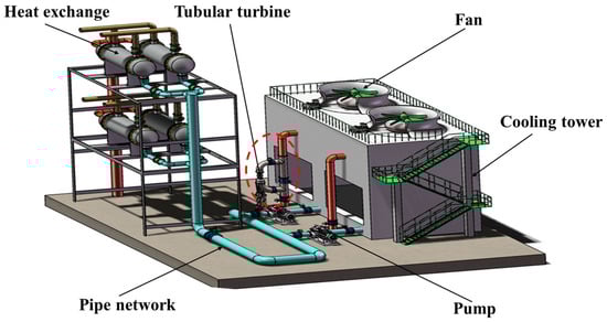 The circulating cooling water system (CCWS) is distinguished by its high energy and water consumption. This system is widely used in oil refining, the chemical industry, thermoelectricity, steel, food, and other fields, and its energy consumption accounts for approximately 20–30% of the total industrial production energy consumption [1]. The main energy-consuming equipment of the CCWS is the water pump and fan, among which the power consumption of the water pump can reach about 80% of the total energy consumption of the system [2]. When the installation elevation of the heat exchanger in the CCWS is larger than that of the cooling tower, a substantial quantity of power from the water pump must be consumed by the valves in the return water pipeline [3,4]. In the two cases in the literature [4], the turbine utilizes the abundant back pressure energy of the system to generate electricity, which can recover 36.8% and 39.1% of the pump power consumption.