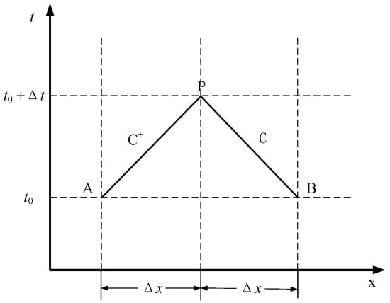 Equations (1) and (2) are characteristic equations represented by C+ and C−, which are explained by Figure 2. Variable Δx is the length of the pipeline that the water hammer travels at time Δt.