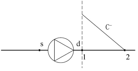 The pressure of the cooling water entering the system pipe network is determined by the liquid level of the sump, and it is considered constant during the transient process. The pressure of the cooling water flowing out of the pipe network into the cooling tower can be approximated to atmospheric pressure. The boundary conditions to be established in this model also include the upstream pump station, the joint of the reducing pipe, the joint of the reducer, and the simplified resistance element of the heat exchanger network. Given the space limitations, this work only establishes the boundary conditions of the running water pump. Take the solution as an example. When the pumping station is in a normal operation, the boundary conditions can be expressed in the form of Figure 3, and the Q–H characteristic curve of the centrifugal pumps in parallel operation can be fitted to a quadratic polynomial.