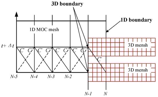 In this work, a coupled simulation method of 1D MOC and 3D CFD is proposed, and the boundary conditions between the 1D and 3D domains are coupled by the method of partial mesh overlap [28,29], as shown in Figure 4.