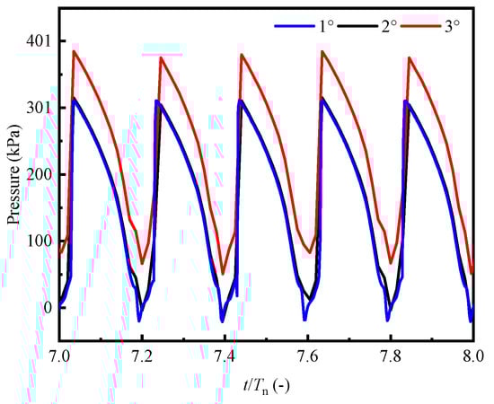 Furthermore, three time steps (1.1 × 10−4, 2.2 × 10−4, and 3.3 × 10−4 s) were used to verify the time-step independence of the 3D model of the hydraulic turbine. The three time steps correspond to the time required for the runner to rotate 1°, 2°, and 3° at the design speed. The pressure calculation results of a certain measuring point in the runner domain under the three time steps are shown in Figure 6. Considering the calculation accuracy and calculation speed, the final time step is 2.2 × 10−4 s. Where Tn is the time required for the runner to rotate for one revolution.