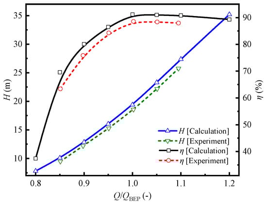 The results are compared with the experimental values, as shown in Figure 7. The numerical simulation is consistent with the distribution law of the experimental values. The optimal flow rate (QBEP) is 4100 m3/h. The numerical simulation and experimental water heads under the optimal working conditions are 19.6 and 18.6, and the efficiencies are 91.2% and 88.3%, respectively; thus, the errors of the water head and efficiency are 5.1% and 3.2%, respectively. The simulated values of the 3D model are in good agreement with the experimental values, thereby accurately reflecting the external characteristics of the turbine. In addition, it can be found that the test results are slightly smaller than the numerical results, mainly because only hydraulic efficiency is considered in the numerical simulation.