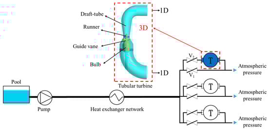 The runaway and shutdown transient processes studied in this work are as follows: when three turbines operate in parallel under the same working conditions to generate electricity, one of the turbines fails and powers off to reach the runaway state. Then, remote control valves V1 and V2 shut off the runaway turbine. A 3D model is established for a hydraulic turbine, the other two parallel turbine branches belong to 1D simulation area, and the water supply network is simplified based on the hydraulic equivalence theory [28,30]. The coupled model is shown in Figure 8. The figure demonstrates that when the turbine unit is in the normal operation, valve V1 is closed, and valve V2 is opened. When the turbine unit is disconnected from the system, valve V2 is closed, and valve V1 is opened.