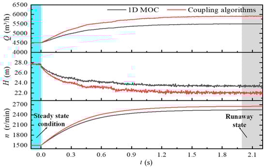 In the coupling calculation, the position of the coupling interface of the turbine inlet and outlet takes the pressure and flow rate as the parameters for data transmission, and the accuracy of the data transmission is ensured through iteration. The independent 1D MOC calculation results care compared to further verify the reliability of the coupled simulation method. The comparison variables include the flow rate, head, and speed of the runaway turbine, and the steady state flow rate before the runaway of the turbine is 1.1QBEP. During calculation, the static pressure of the sump is 19,600 Pa and the local atmospheric pressure is 101,325 Pa. The comparison results are shown in Figure 9. The results of the two methods show good consistency. Moreover, the flow rate, head, and rotational speed of the turbine are basically stable under the runaway state of the turbine.