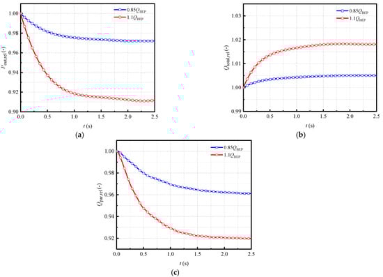 To more intuitively analyze the variation law of the main operating parameters of CCWS with time during the runaway process, three dimensionless coefficients are introduced, namely, the system return pressure relative value, the relative value of the system flow rate, and the turbine flow rate in parallel with the runaway turbine. The flow rate of two parallel turbines in normal operation is almost the same. The relative values, denoted as Pout,rel, Qtotal,rel, and Qpar,rel, represent the ratio of the instantaneous value of each parameter to the initial value before escape, as shown in Equation (18)