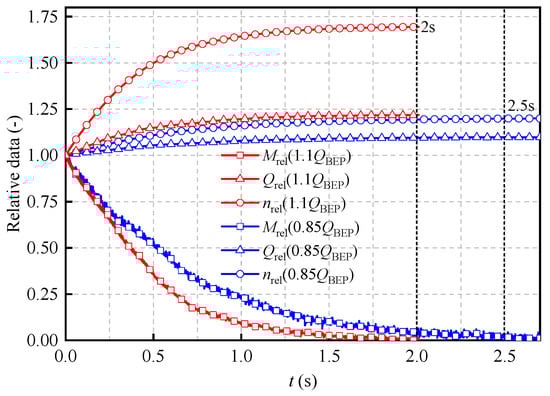 Three dimensionless coefficients are introduced again to analyze the variation law of the main parameters of the turbine with time during the runaway process: the relative values of the speed, flow rate, and torque of the runaway turbine, denoted as nrel, Qrel, and Mrel, as shown in Equation (19):
