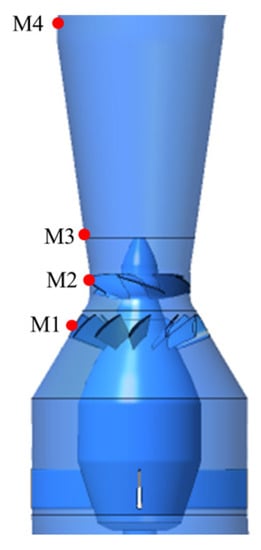 To comprehensively analyze the pressure pulsation characteristics of the tubular turbine during the runaway process, four monitoring points are set up at typical positions in each area of the turbine flow channel, which are arranged at the M1 point in the guide vane area, the M2 point in the runner area, the M3 point in the straight cone of the draft tube, and the M4 point downstream of the straight cone section of the draft tube, as shown in Figure 12.
