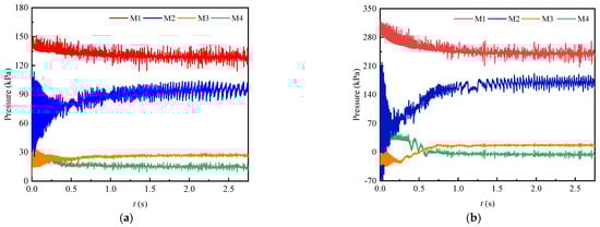 The runaway of the turbine will affect the pressure of the system pipe network. Considering that the turbine is set on the system return water tower pipeline, the pressure fluctuation will first be reflected in the system return water pressure. Accordingly, this work takes the variation trend of the system return water pressure as an example to illustrate the influence of the runaway process on the system pressure, as shown in Figure 10a. After the turbine runaway occurs in the system, the return water pressure of the system will gradually decrease and eventually become stable, and the water hammer problem will be not be evident. The return water pressure of the 1.1QBEP working condition dropped by about 9%, and the 0.85QBEP working condition was approximately 3% lower. The 1.1QBEP working condition had a larger drop in the return water pressure compared with the 0.85QBEP working condition.