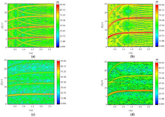 Time–frequency analysis of the pressure signals at points M2 and M3. (a) 0.85QBEP—M2. (b) 1.1QBEP—M2. (c) 0.85QBEP—M3. (d) 1.1QBEP—M3.