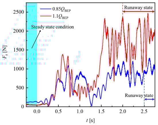 Figure 15 shows the time domain diagram of the radial force on the runner during the runaway process under the two operating conditions. In the development process of the runaway, the radial force has a similar increasing trend under the two working conditions. The increasing and decreasing nodes of the radial force in the small flow rate condition lag behind the large flow rate condition. This phenomenon is related to the longer time required for the speed to reach the runaway state under low flow rate conditions. In the initial stage (t < 0.25 s) after the turbine loses its load due to inertia, the radial force is basically close to the initial steady state condition. In addition, the radial force has an obvious local minimum phenomenon in the middle stage of runaway development (about t = 1 and 1.25 s) under the two working conditions. In the middle and late stages of the runaway development, the fluctuation of the radial force with time is similar to the runaway state because the rotational speed is close to the runaway speed at this time, and it shows a violent oscillation phenomenon with time.