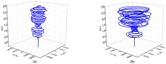 The time domain diagram of the radial force component of the runner under two flow rate conditions (0.85QBEP, 1.1QBEP) is drawn to further analyze the variation law of the component forces of the radial force in the x and y directions during the runaway development process, as shown in Figure 16. In the process of runaway development, the component forces of the radial force in the x and y directions substantially increase, and the increase is consistent. In the middle stage of runaway development, the components of radial force in the x and y directions are significantly reduced. In particular, the component forces in both directions are close to zero in the small flow rate condition.